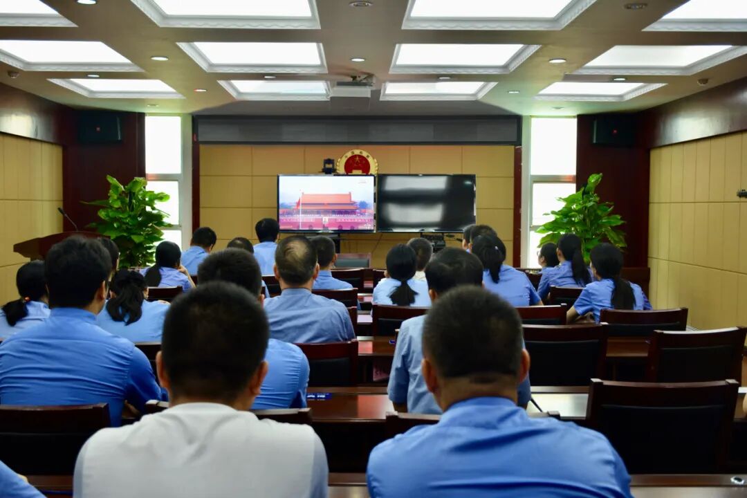 直播画面中,天安门广场上的气氛庄严而热烈。习近平总书记发表重要讲话时,干警们神情专注、认真聆听,深刻领悟铭记历史、缅怀先烈,珍爱和平、开创未来的重要意义。阅兵式中,气势恢宏的空中护旗梯队、整齐划一的徒步方队、威武雄壮的装备阵列、威风凛凛的战旗方队、翱翔蓝天的空中梯队……每一个画面都让干警们心潮澎湃,不时爆发出热烈的掌声。